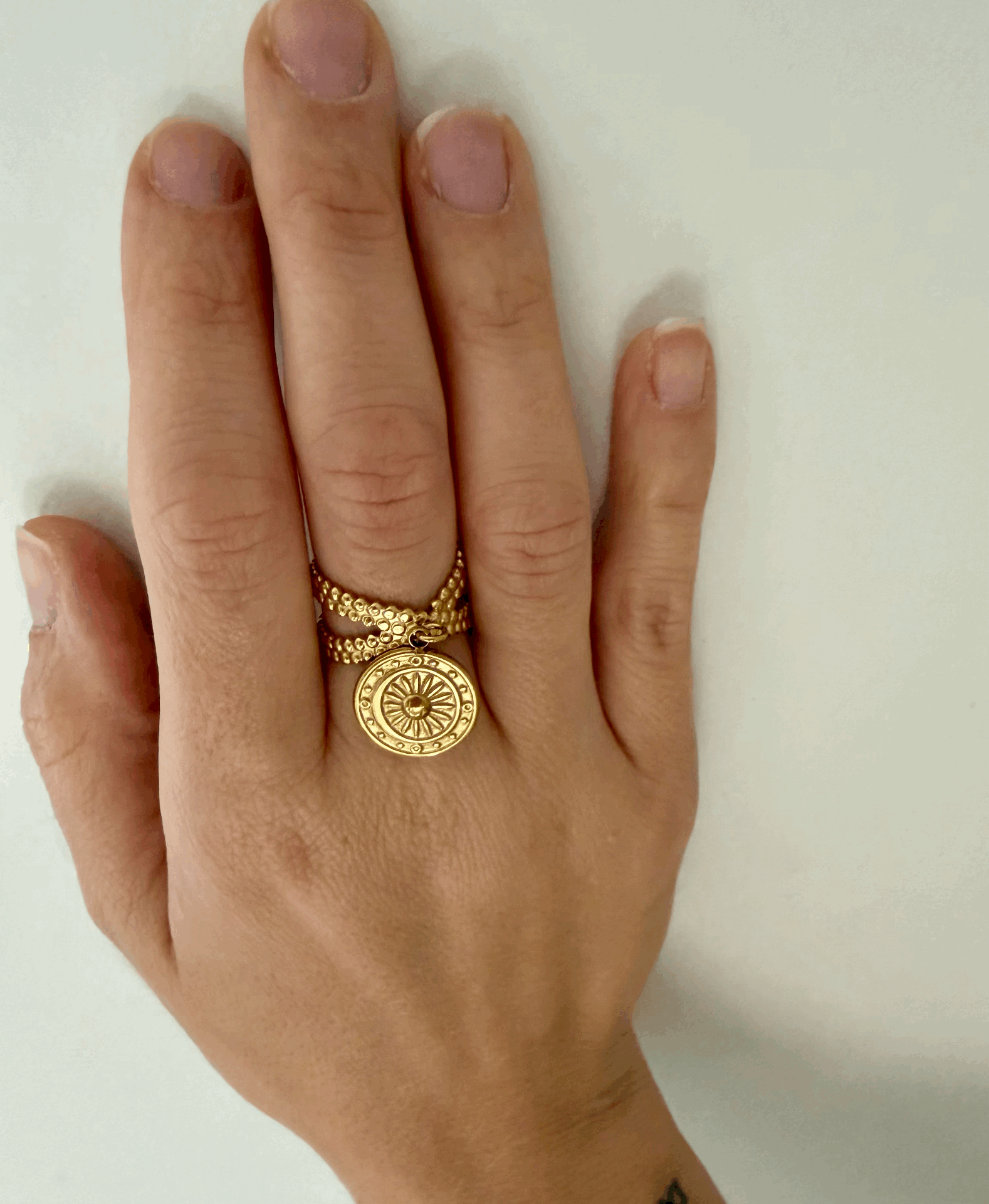 Cette bague torsadée en acier inoxydable dorée séduit par son design original. Elle est sublimée par un médaillon soleil qui apporte une touche lumineuse et tendance.
