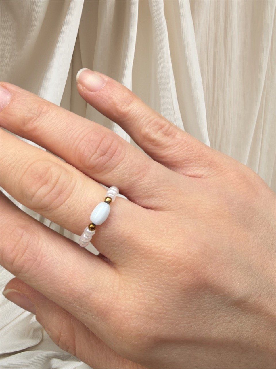 Cette bague associe la pureté des perles blanches, la tendresse du bleu pâle et la chaleur des perles dorées en acier inoxydable. Un bijou élégant et lumineux, parfait pour ajouter une touche délicate à chaque geste.