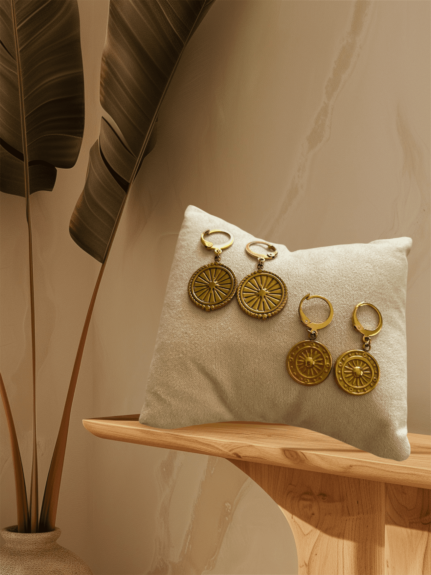 Elégantes, ces boucles d'oreilles en acier inoxydable doré allient sophistication et originalité. chaque paire présente des médaillons délicatement gravé, accompagnés des motifs fleurs étoile, pour un look unique et lumineux. Disponibles en 2 tailles.