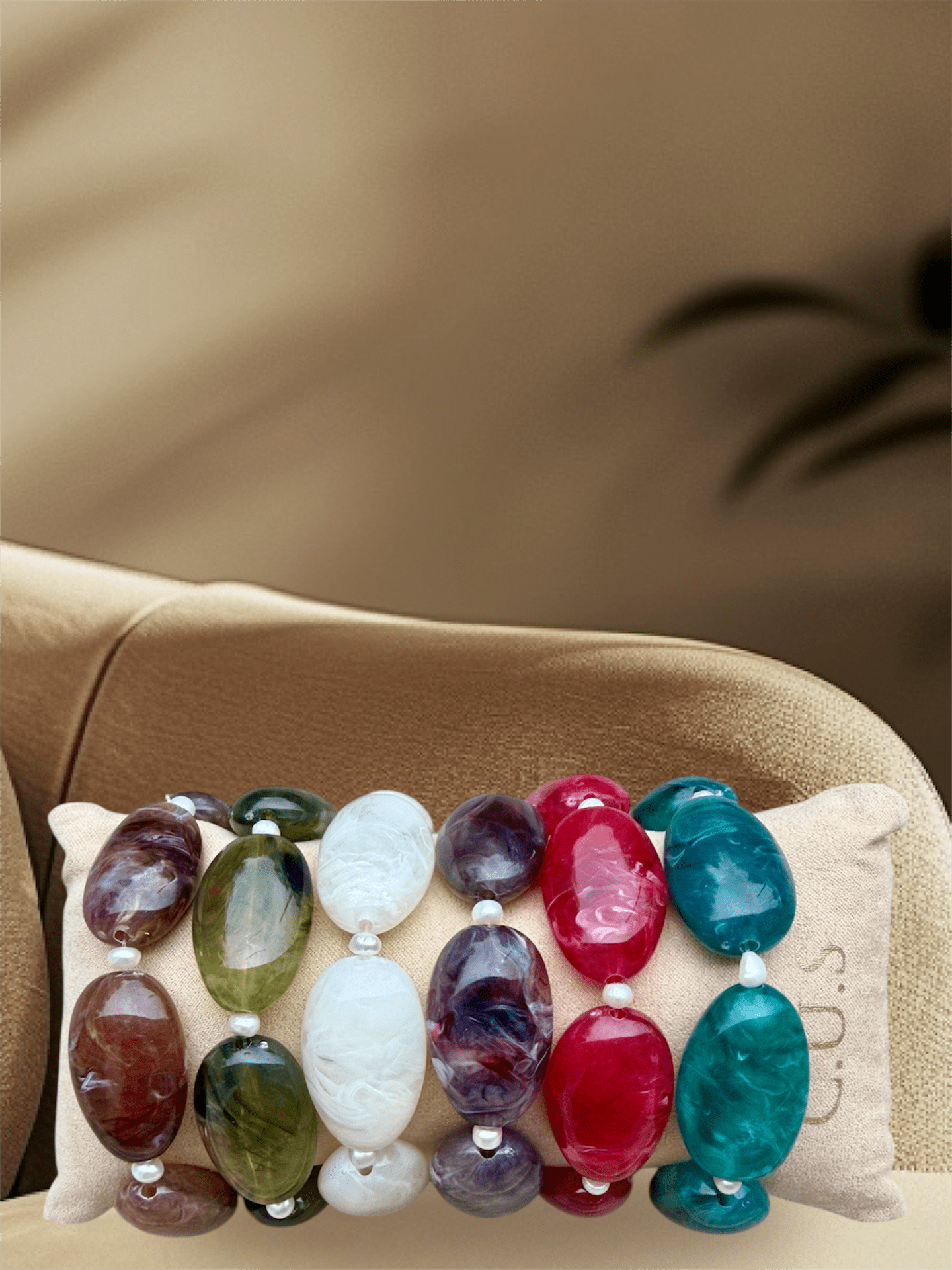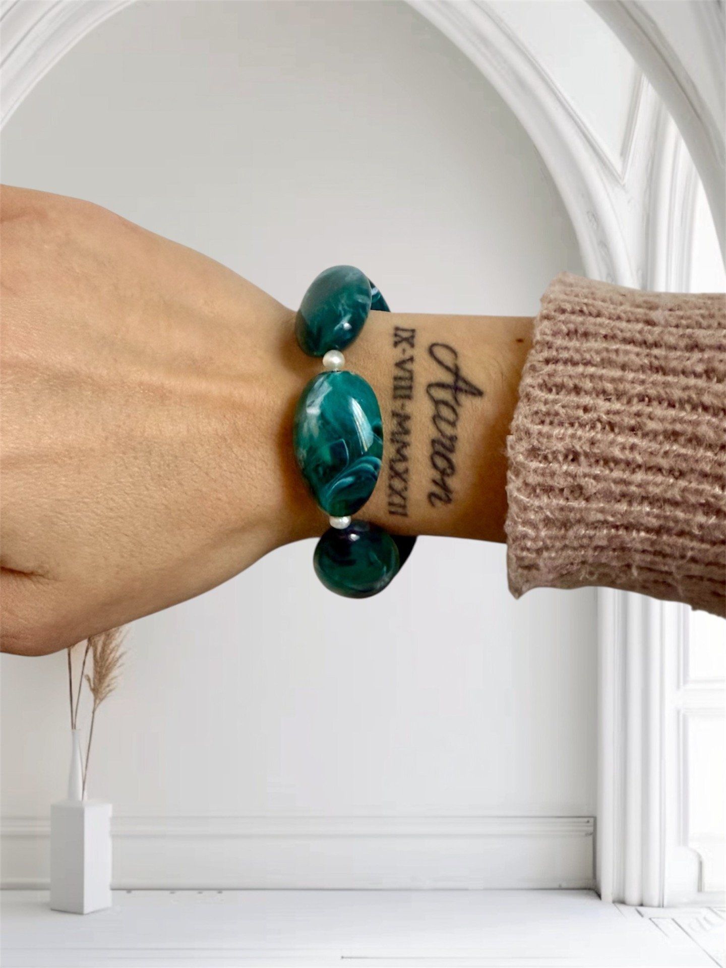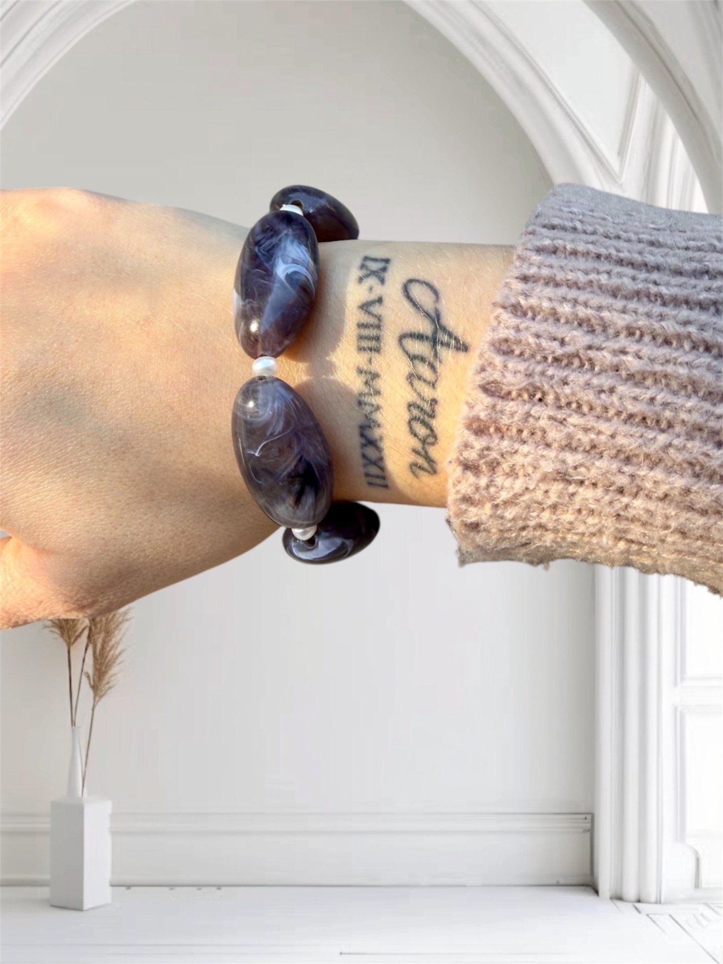 Découvre ce bracelet au charme unique, composé de grosses perles ovales au rendu marbré. Chaque perle présente des nuances profondes et naturelles qui captent la lumière avec des petites perles d'eau douce qui ajoutent une note délicate et harmonieuse.