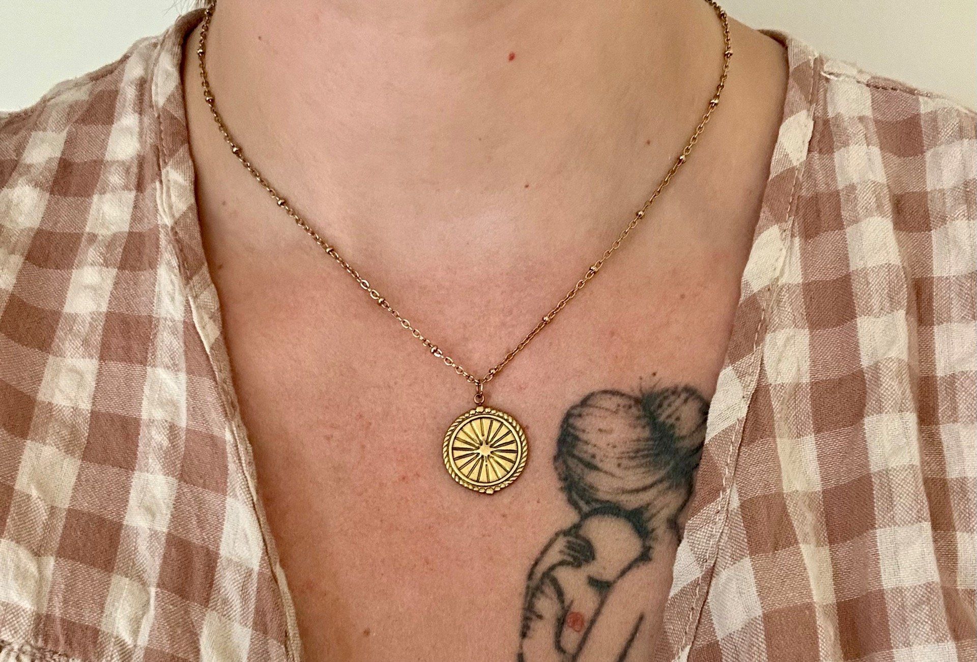 Ce collier combine l'élégance avec sa chaîne fine ornée de petites boules délicates et la puissance symbolique d'un médaillon solaire.Un collier à la fois minimaliste et rayonnant, pensé pour les femmes qui veulent briller au naturel.