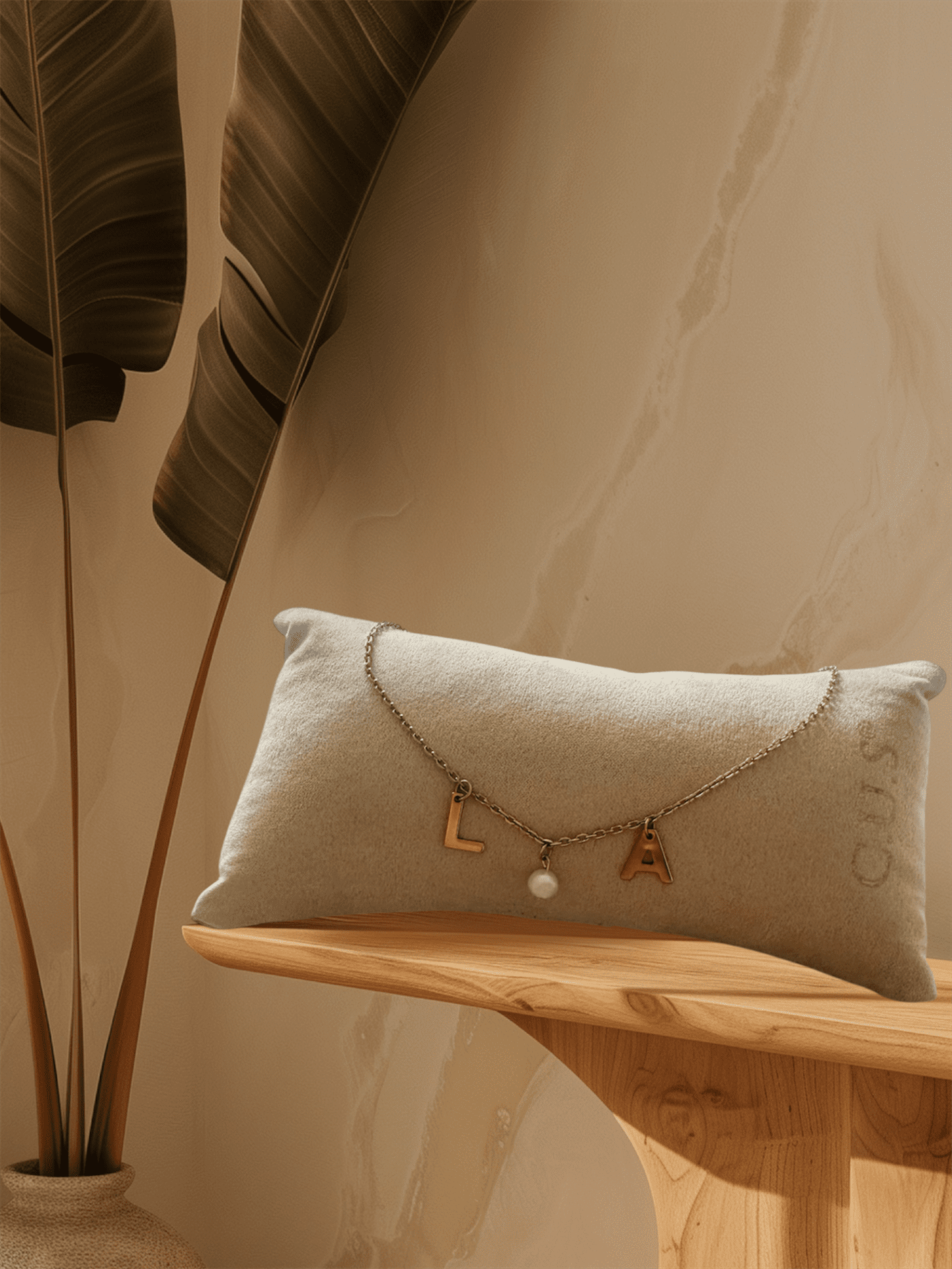 Un collier délicat et chargé de sens. Ce collier en acier inoxydable doré se compose d'initiales suspendues, associées à de la véritable perle d'eau douce, pour un bijou à la fois raffiné, intemporel et profondément personnel.